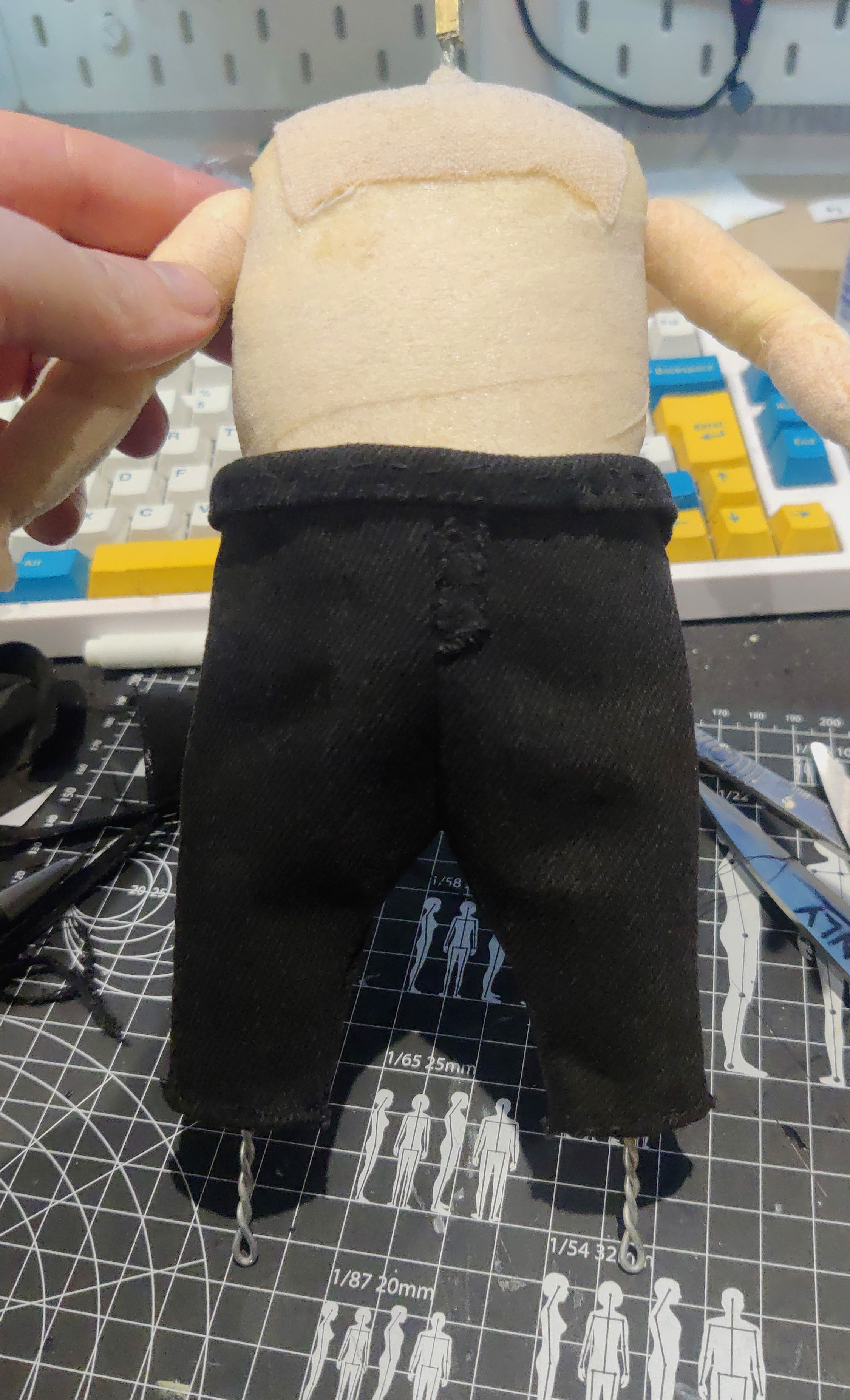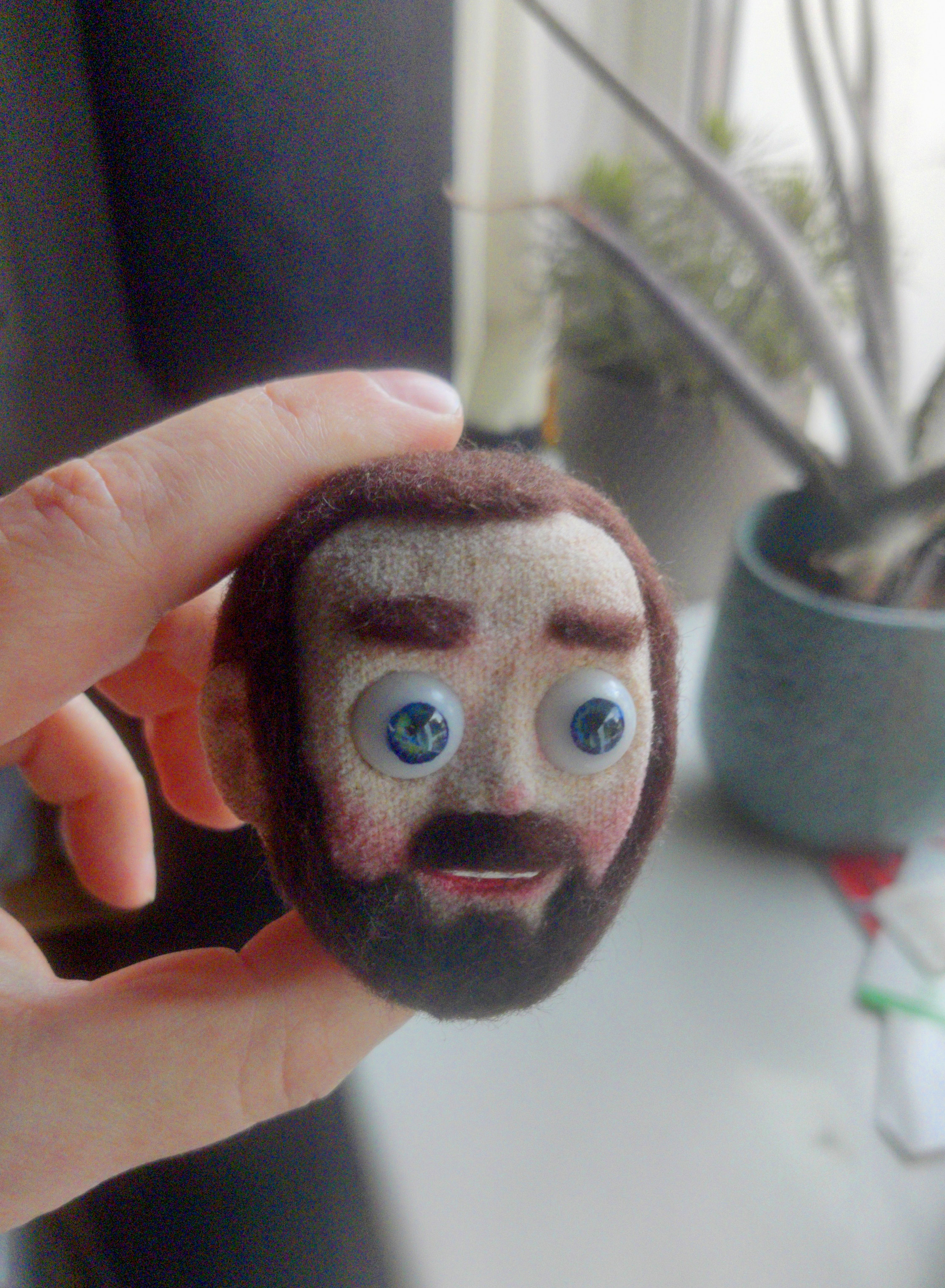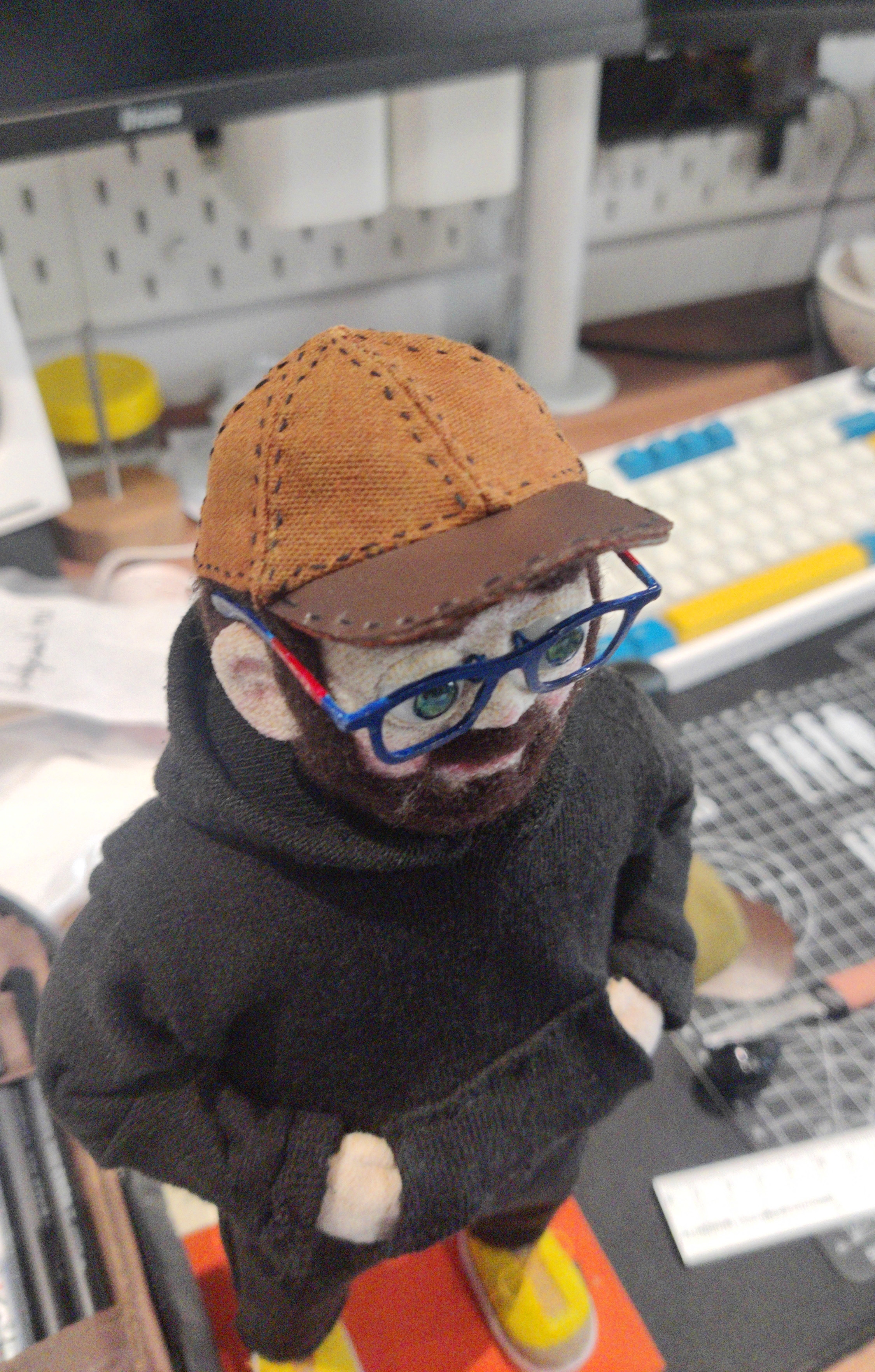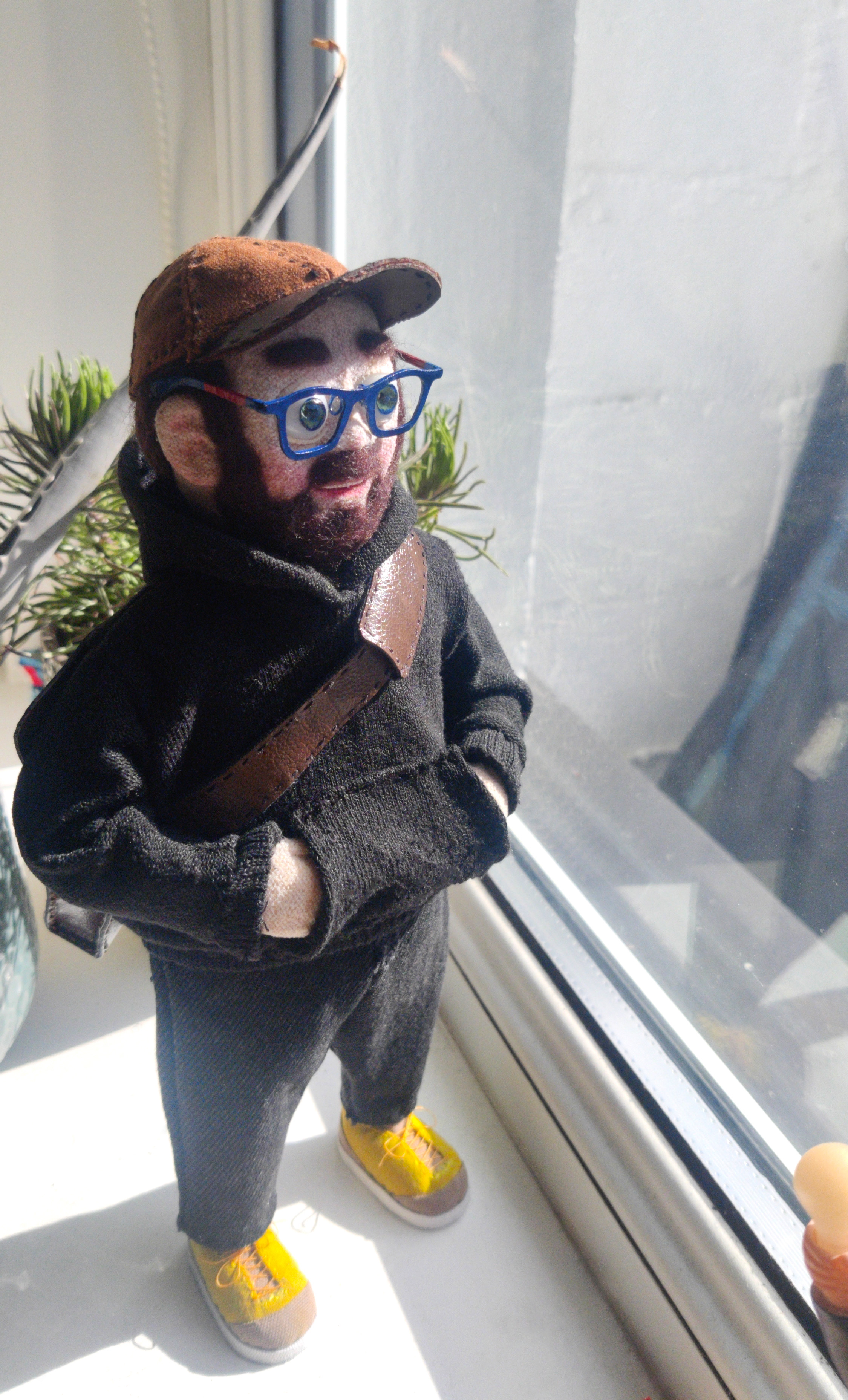 The bulk of the body was made with balsa and upholstry foam, this was wrapped with foam bandage and coated with latex. Sliding brass inserts were used to make the head limbs and lower torso removable for repairs. The limb's internals were made using twisted wire with polymer clay bones for stability and again covered in foam and latex. The head was sculpted in polymer clay over a wire and foil armiture, finished with a fabric bandage top layer, dry brushed with pastels, and coated in fabric stiffner. The eyes were made using POM ball bearings, oil-painted, and finished with clear epoxy. The hair was felted from loose wool roving on a styrofoam head form, before being transferred to the puppet. The clothing was primarily made from scraps of my own old clothing. The messenger bag was made from a vegan leather furniture repair patch. The body also has an armiture fixing point embedded in the back of the lower torso.