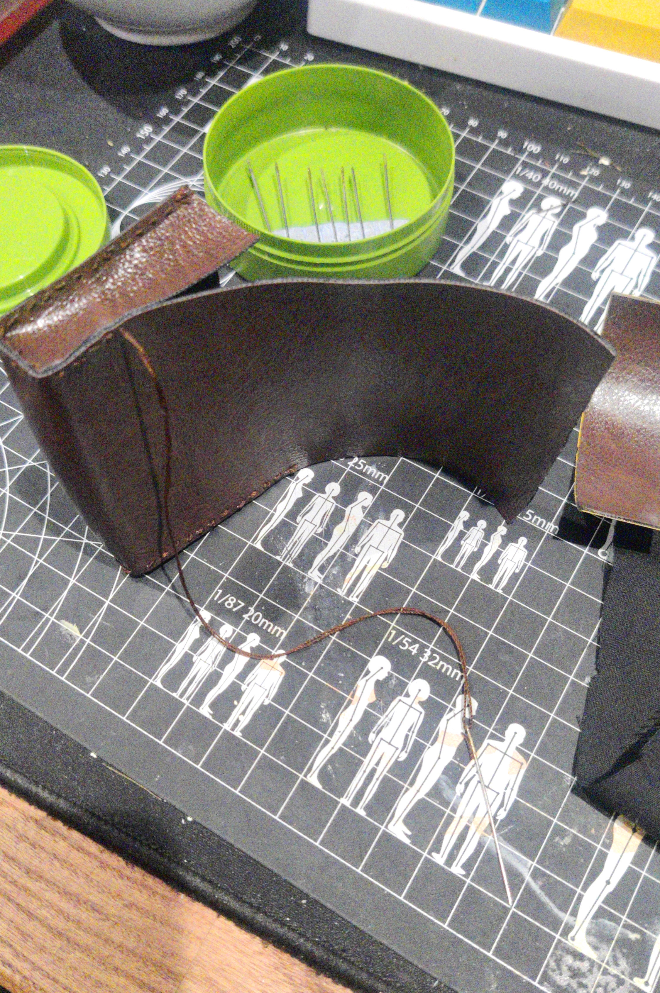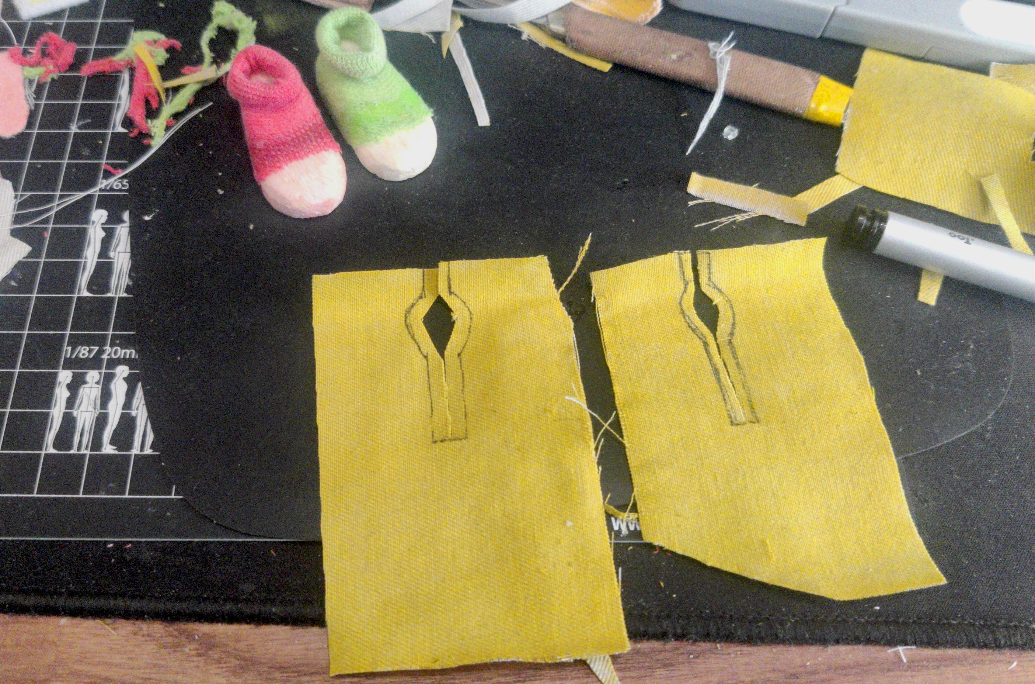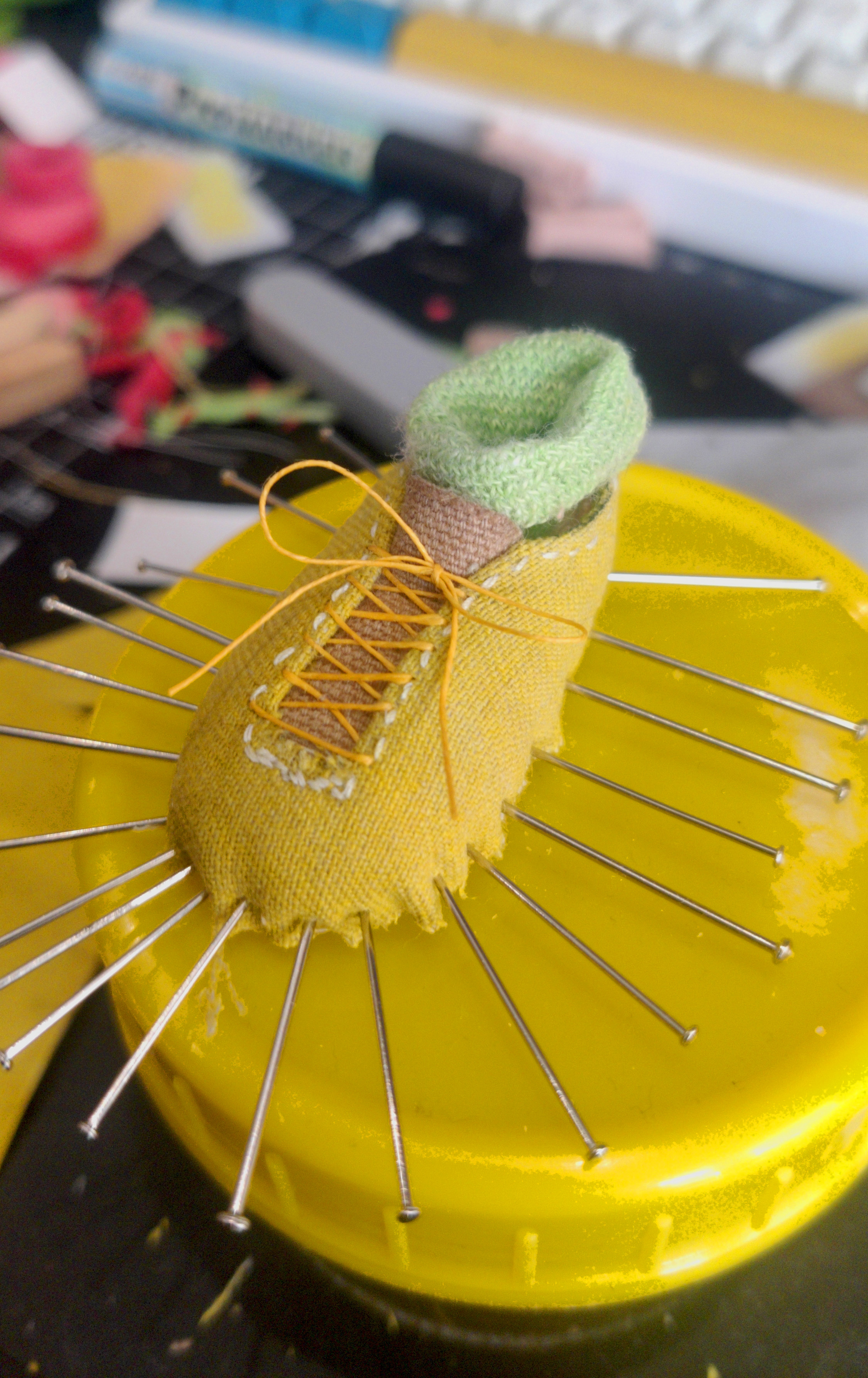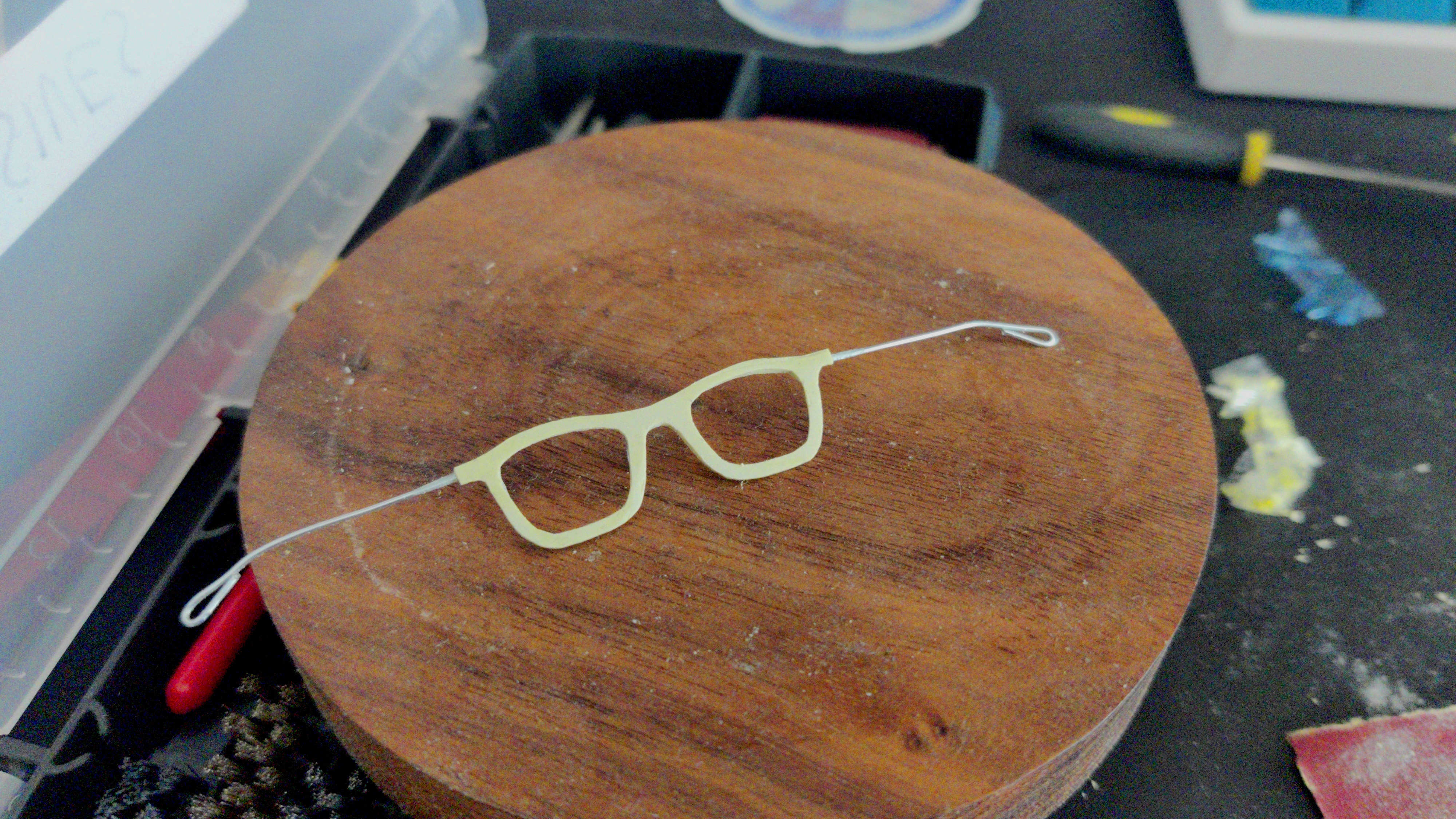 The bulk of the body was made with balsa and upholstry foam, this was wrapped with foam bandage and coated with latex. Sliding brass inserts were used to make the head limbs and lower torso removable for repairs. The limb's internals were made using twisted wire with polymer clay bones for stability and again covered in foam and latex. The head was sculpted in polymer clay over a wire and foil armiture, finished with a fabric bandage top layer, dry brushed with pastels, and coated in fabric stiffner. The eyes were made using POM ball bearings, oil-painted, and finished with clear epoxy. The hair was felted from loose wool roving on a styrofoam head form, before being transferred to the puppet. The clothing was primarily made from scraps of my own old clothing. The messenger bag was made from a vegan leather furniture repair patch. The body also has an armiture fixing point embedded in the back of the lower torso.